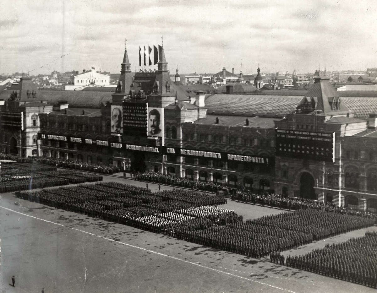 Сталинский Первомай (30-е — 50-е) — официозный праздник, в котором все еще достаточно искреннего энтузиазма, но на первый план выходит энтузиазм показной. Изменилась и идея шествий: вместо переустройства мира — мощь государства и новых людей, которые в едином порыве ему служат. Знаменитые парады физкультурников, лозунги про внутренних и внешних врагов великой страны и ее вождя. Участвовать в первомайском шествии — значимо, это большая ответственность и долг перед Родиной.