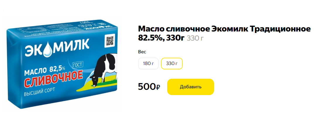 Впрочем, даже эти драматичные цифры не отражают реальности. В самых массовых и народных сетях — «Пятерочка» и «Магнит» — самое дешевое масло даже со скидками стоит сейчас больше 1200 рублей за килограмм (220 рублей за пачку 180 грамм). Речь идет о более-менее надежных брендах, которые соблюдают ГОСТ и не добавляют в масло трансжиры и о масле 85,5 %. В масле 72,5% — «Крестьянском» (название по ГОСТу), в лучшем случае просто меньше масла, но, вероятнее всего, всевозможные добавки.
